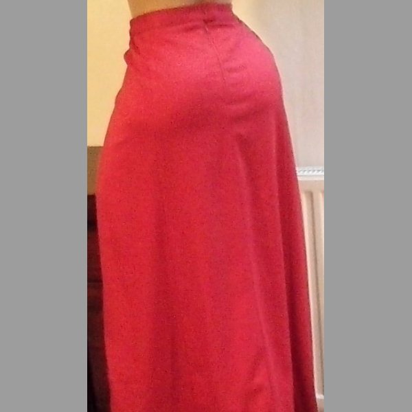 poutích, na velké svátky do kostela. Vlněná sukně je plisovaná, dlouhá 80 cm a je v pěkném stavu, i když je téměř 80 let stará. Dole ji zdobí červená 11 cm široká stuha.Tato
